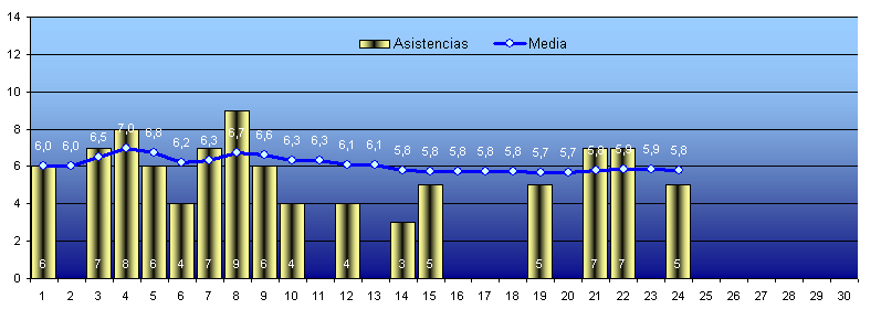 2025-2026 Media asistencia Sábados: 5,812024-2025 Media asistencia Sábados: 06,62 2023-2024 Media asistencia Sábados: 06,54 2022-2023 Media asistencia Sábados: 06,22 2021-2022 Media asistencia Sábados: 08,04 2020-2021 Media asistencia Sábados: 08,74 - Domingos: 05,00 - General: 07,00 2019-2020 Media asistencia Sábados: 07,39 - Domingos: 04,86 - General: 06,43 2018-2019 Media asistencia Sábados: 08,24 - Domingos: 04,70 - General: 06,542017-2018 Media asistencia Sábados: 08,19 - Domingos: 05,30 - General: 06,77 2016-2017 Media asistencia Sábados: 09,79 - Domingos: 05,77 - General: 07,67 2015-2016 Media asistencia Sábados: 12,47 - Domingos: 07,87 - General: 10,08 2014-2015 Media asistencia Sábados: 11,71 - Domingos: 06,41 - General: 09,02 2013-2014 Media asistencia Sábados: 11,48 - Domingos: 07,06 - General: 09,17 2012-2013 Media asistencia Sábados: 13,79 - Domingos: 07,63 - General: 10,66 2011-2012 Media asistencia Sábados: 12,61 - Domingos: 07,22 - General: 10,53 2010-2011 Media asistencia Sábados: 12,59 - Domingos: 08,74 - General: 10,51 2009-2010 Media asistencia Sábados: 13,15 - Domingos: 07,58 - General: 10,36 2008-2009 Media asistencia Sábados: 13,36 - Domingos: 06,13 - General: 09,86 2007-2008 Media asistencia Sábados: 14,09 - Domingos: 07,66 - General: 10,94 2006-2007 Media asistencia Sábados: 13,20 - Domingos: 07,50 - General: 10,30 2005-2006 Media asistencia Sábados: 17,10 - Domingos: 08,70 - General: 13,30 2004-2005 Media asistencia Sábados: 18,10 - Domingos: 10,50 - General: 13,80 2003-2004 Media asistencia Sábados: 15,40 - Domingos: 06,60 - General: 11,20 2002-2003 Media asistencia Sábados: 09,90 - Domingos: 06,30 - General: 08,00 |